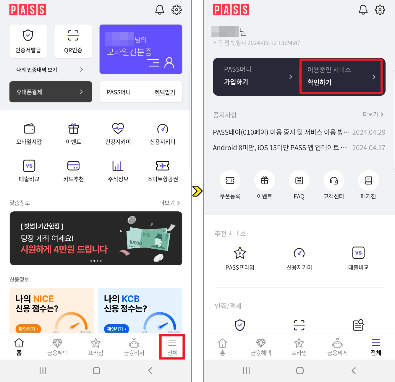 서비스 해지 방법은 간단한데 일단은 폰에서 PASS 앱을 실행한 다음 홈 화면이 열리면 좌측 하단에 있는 [전체] 메뉴를 탭합니다.