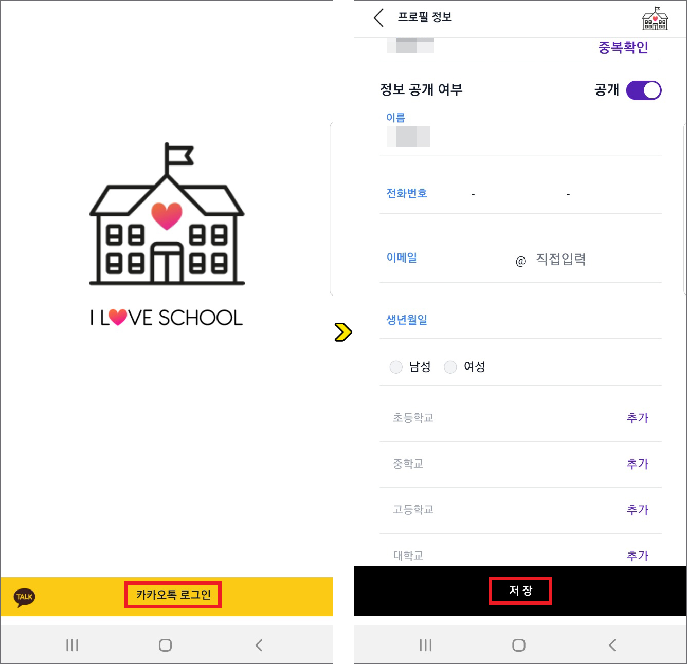 가입이 완료되면 [정보 등록하기]를 누르고 본인의 이름, 전화번호, 이메일, 성별, 학교를 추가하고 [저장]을 해주세요.