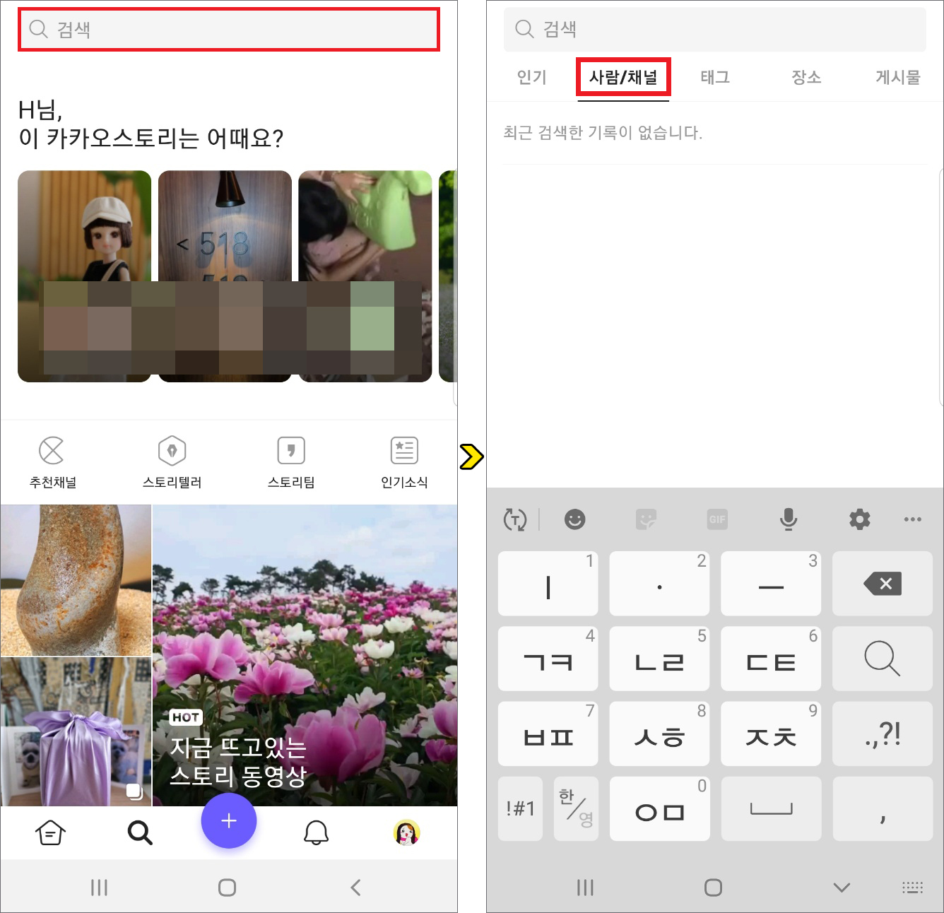 바뀐 화면 상단 검색란을 터치한 다음 [사람/채널]을 선택한 상태에서 친구의 아이디 또는 닉네임을 정확히 알고 있다면 입력 후 찾아보시면 될 거예요.