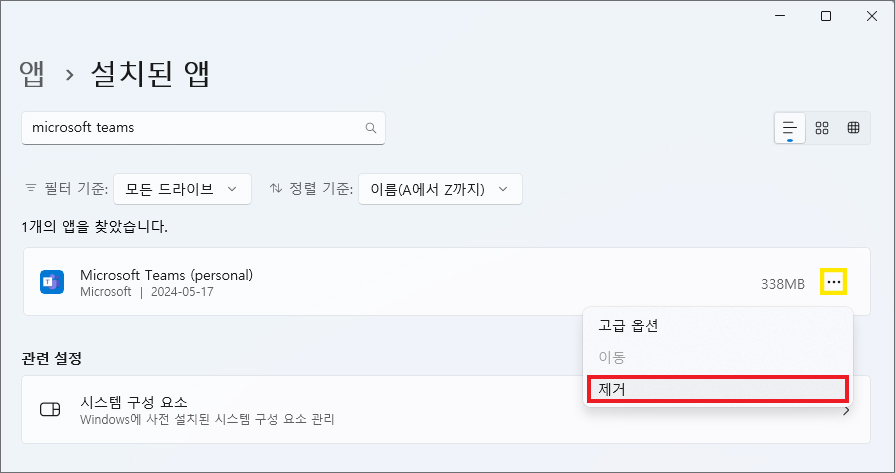 검색 결과로 나온 Microsoft Teams (Personal) 우측에 있는 점 3개 표시를 클릭한 다음 [제거]를 누릅니다.