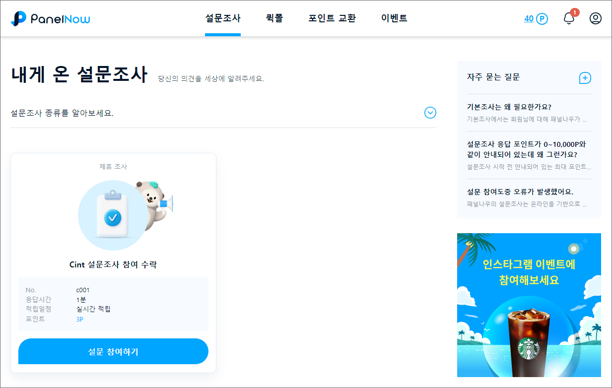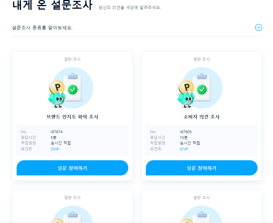 기본조사의 경우 약 5분 정도 소요되며 문항당 1P를 주는데 끝까지 응답하면 더 많은 설문에 참여할 수 있는 기회를 얻을 수 있습니다.