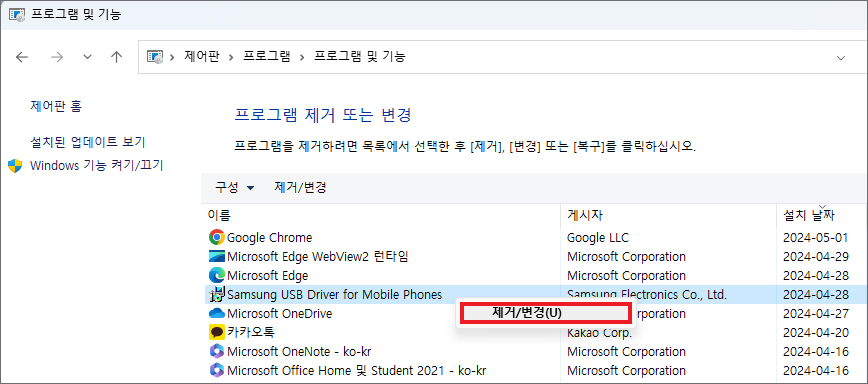 제어판에 있는 [프로그램 제거]를 클릭하시면 Samsung USB Driver for Mobile Phones를 쉽게 찾을 수 있으니 선택하고 우클릭해서 [제거]를 해줍니다.