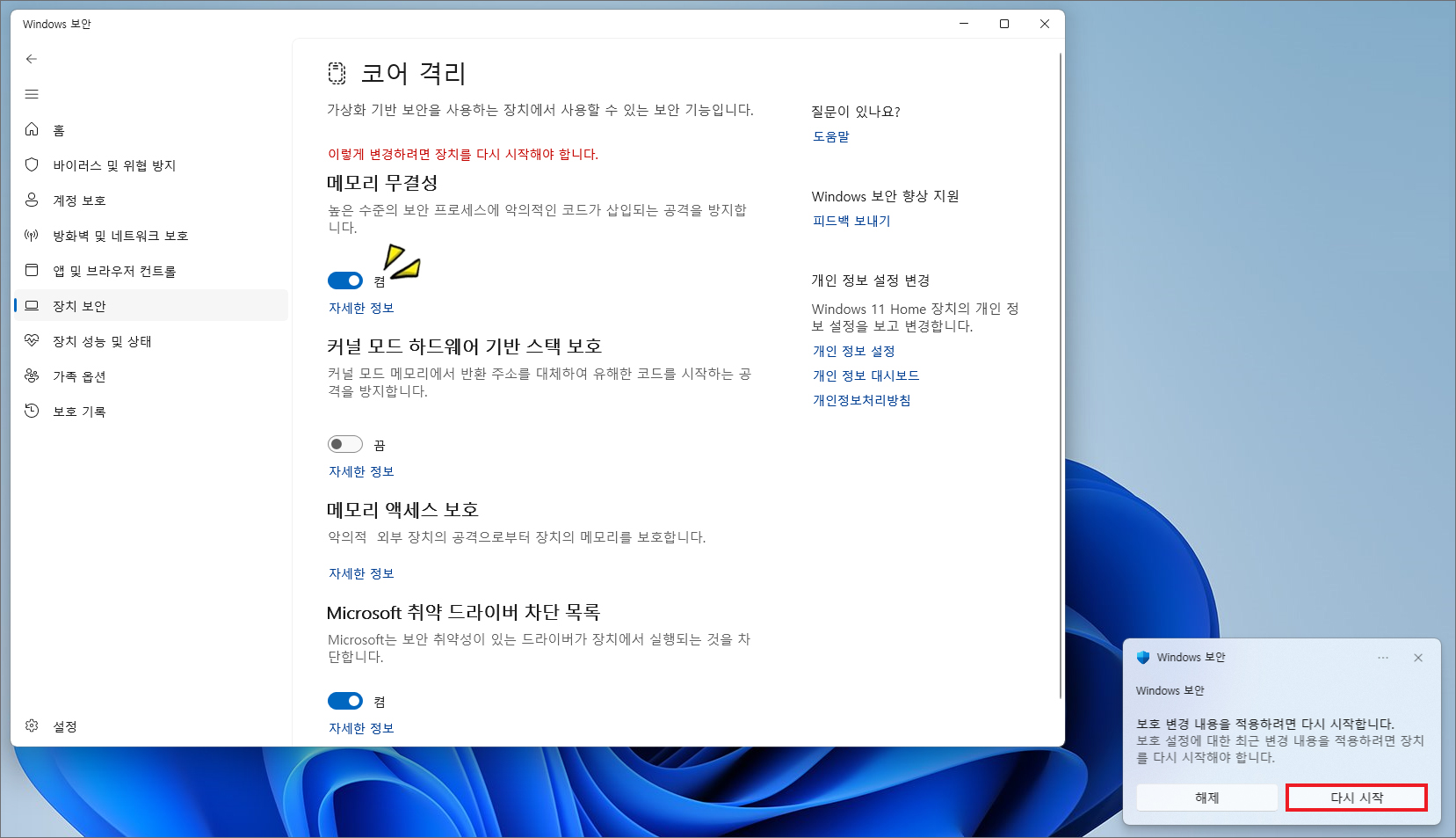 그러고 나서 다시 메모리 무결성 설정 화면으로 들어간 다음 [다시 검사]를 누르면 스위치가 켬으로 바뀐 걸 볼 수 있을 것이며 보호 변경 내용을 적용하려면 다시 시작을 해야 된다는 알림이 뜰 테니 [다시 시작]을 눌러주시면 됩니다.