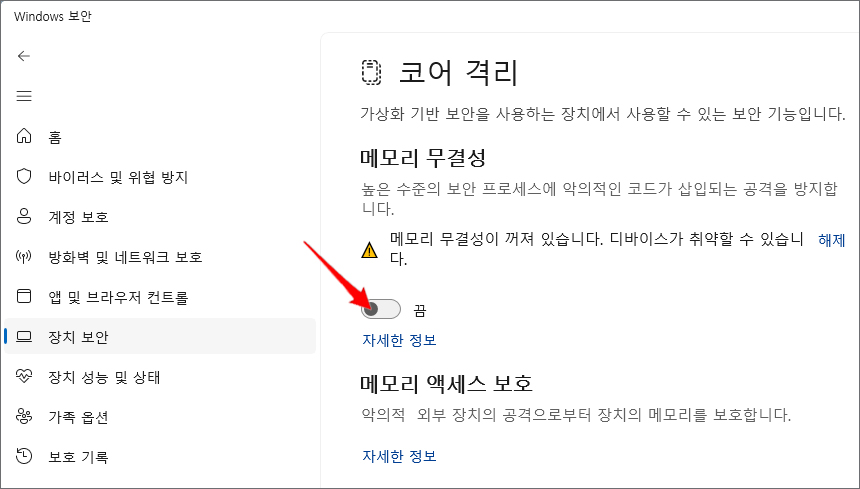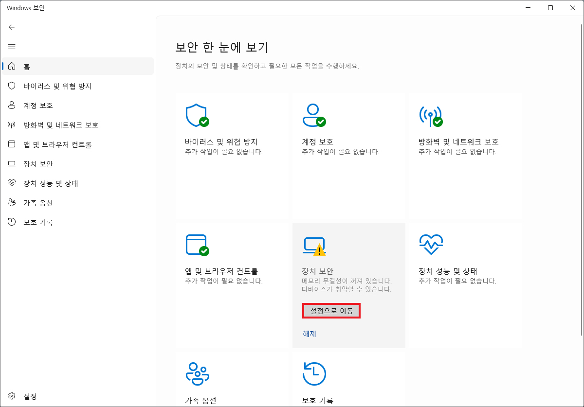 메모리 무결성이 꺼져 있습니다 알림이 떴을 때 알려드린 간단한 방법으로 조치를 취할 수 있으니 사용자가 판단해서 선택을 하시면 되겠고요.