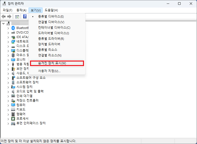 만약 그래도 해결되지 않는다면 좌측 하단에 있는 시작 메뉴를 우클릭해서 [장치 관리자]를 선택하고 창이 열렸을 때 상단 메뉴 중 [보기]를 클릭하고 [숨겨진 장치 표시]를 클릭하세요.