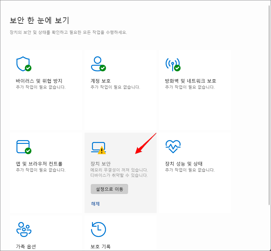 창이 열리면 보안 한 눈에 보기의 항목들이 나오는데 이 중에서 장치 보안에 표시된 [설정으로 이동] 버튼을 누릅니다.