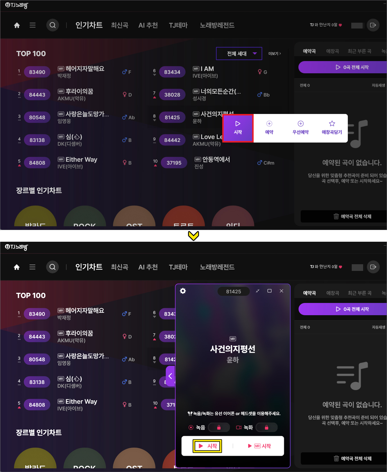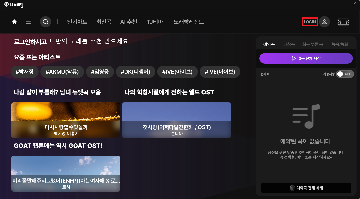 상단에는 인기차트, 최신곡, AI 추천, TJ테마, 노래방레전드가 있고 우측에는 예약곡 애창곡 최근 부른 곡, 녹음/녹화도 할 수 있다는 걸 알게 되실 겁니다.
