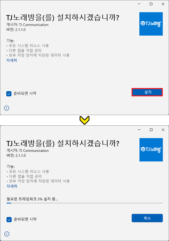 그러면 TJ노래방을 설치할 거냐고 물어보는 창이 나타나는데 [설치]를 눌러주시고 이어서 필요한 프레임워크를 설치하게 될 테니 잠시만 기다려주시면 됩니다.