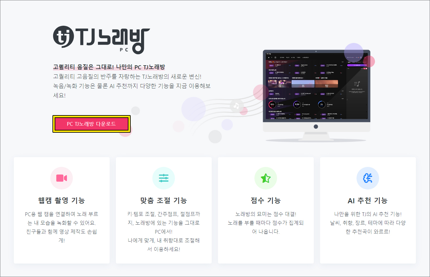 다음 화면을 보면 [PC TJ노래방 다운로드] 버튼이 마련되어 있으니 눌러주시고 해당 프로그램을 실행하면 알게 되겠지만 웹캠 촬영, 맞춤 조절, 점수, AI 추천 기능이 지원되고 있으니 진짜 노래방에 온 것처럼 즐길 수 있을 것입니다.
