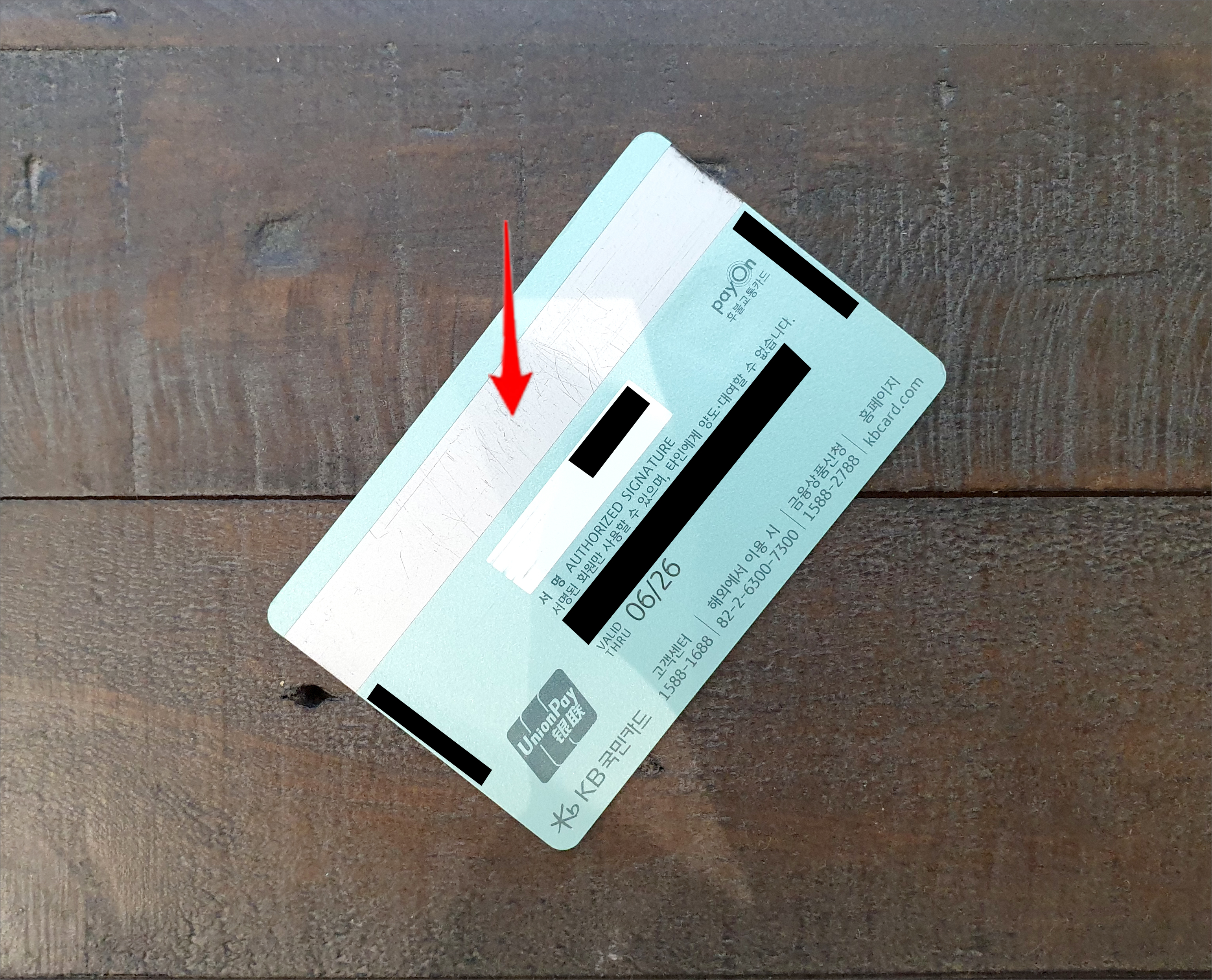 카드 뒷면을 보면 검은색 또는 회색 자석띠로 마그네틱이 있는 걸 볼 수 있는데 카드를 위에서 아래로 긁어서 결제를 할 수도 있으니 시도해 보시길 바랄게요.