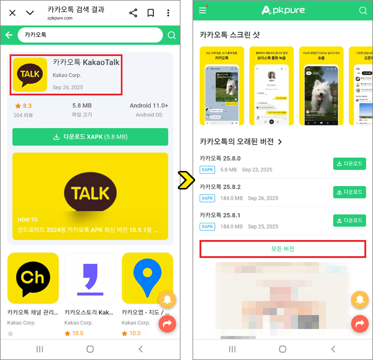 상세 페이지로 이동하면 카카오톡의 오래된 버전으로 리스트가 보이는데 더 예전 버전을 원한다면 [모든 버전] 버튼을 누릅니다.