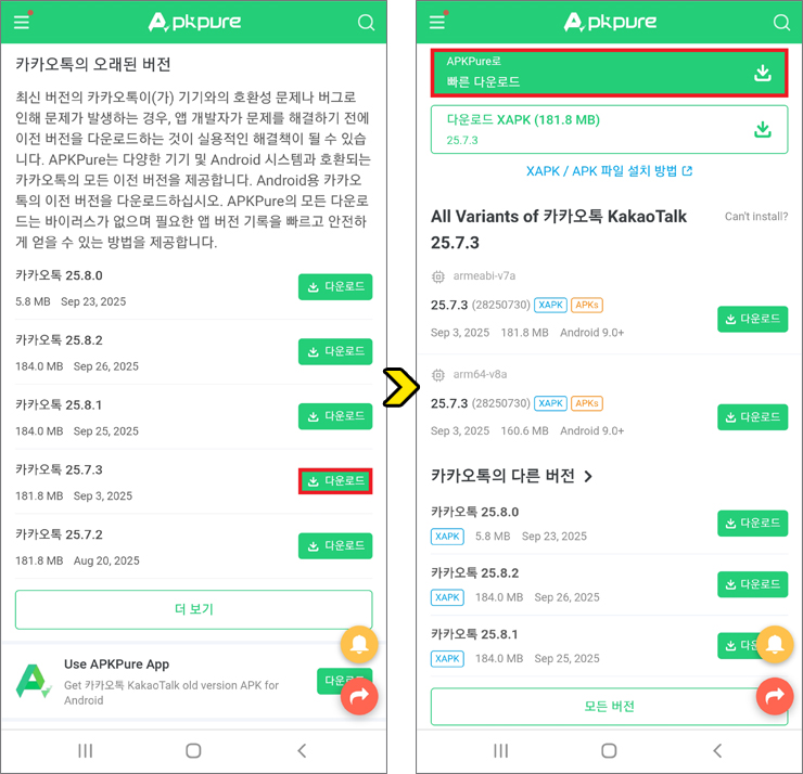 바뀐 화면에서 카톡의 오래된 버전을 좀 더 확인할 수 있는데 안정적으로 사용할 수 있고 논란이 된 기능이 빠진 버전은 25.7.3이니 찾아보시고 옆에 [다운로드] 버튼을 눌러주세요.