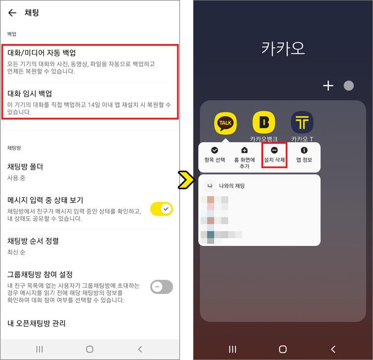 설치를 하기에 앞서 먼저 채팅 내용을 백업해 줄 필요가 있는데 백업은 하단 우측에 있는 점 3개의 더보기> 설정> 채팅> 대화/미디어 자동 백업 또는 대화 임시 백업 중 선택하시면 되고요.