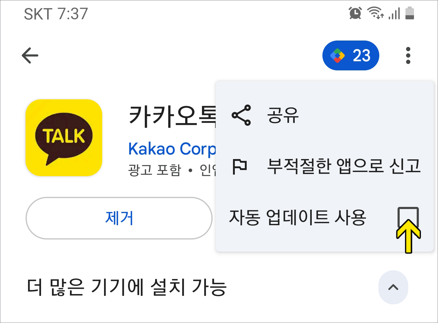 Play 스토어에 들어가서 카카오톡을 검색한 다음 선택하여 우측 상단에 있는 점 3개 표시를 눌러 자동 업데이트 사용 항목을 이와 같이 체크되어 있지 않게 해제해야 되는 걸 잊지 마시길 바랍니다.