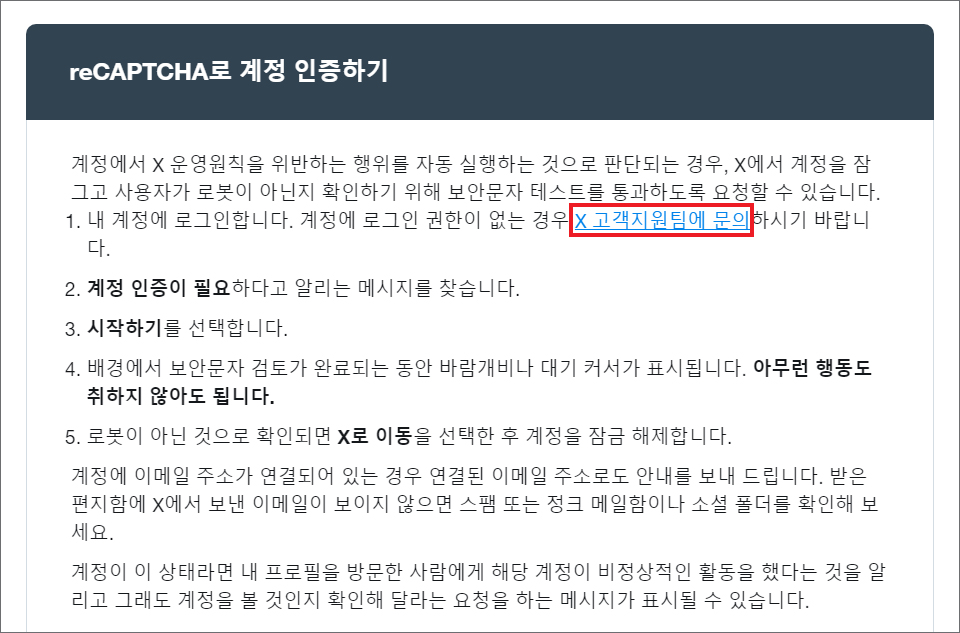 X 고객센터 화면이 열리면 계정 관리 항목 밑에 [잠기거나 제한된 계정 관련 도움말]이 있으니 선택하시고 넘어간 화면에서 맨 밑으로 내려보시면 reCAPTCHA로 계정 인증하기 밑에 'X 고객지원팀에 문의'로 파란색 링크를 찾을 수 있으니 눌러주세요.