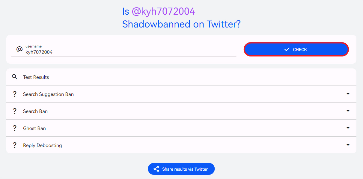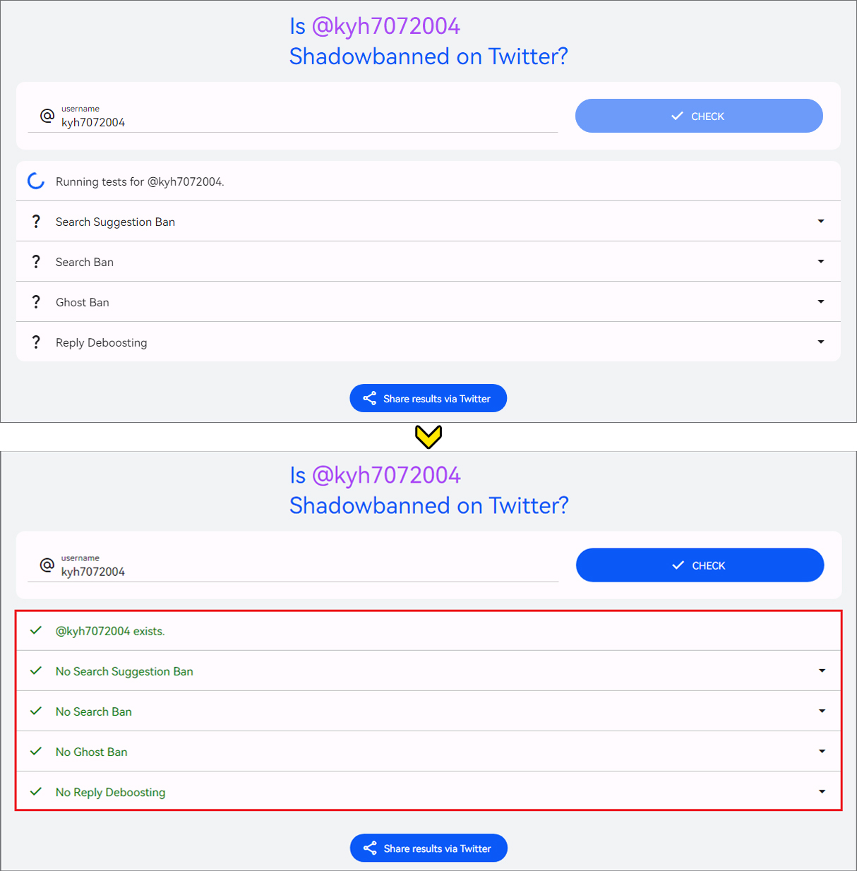 다시 돌아온 유령계 확인 사이트에서 username 입력란에 붙여넣기를 하시거나 확인한 사용자 이름을 동일하게 입력한 상태에서 CHECK 버튼을 클릭하면 트위터 계정 상태를 확인할 수 있으세요.