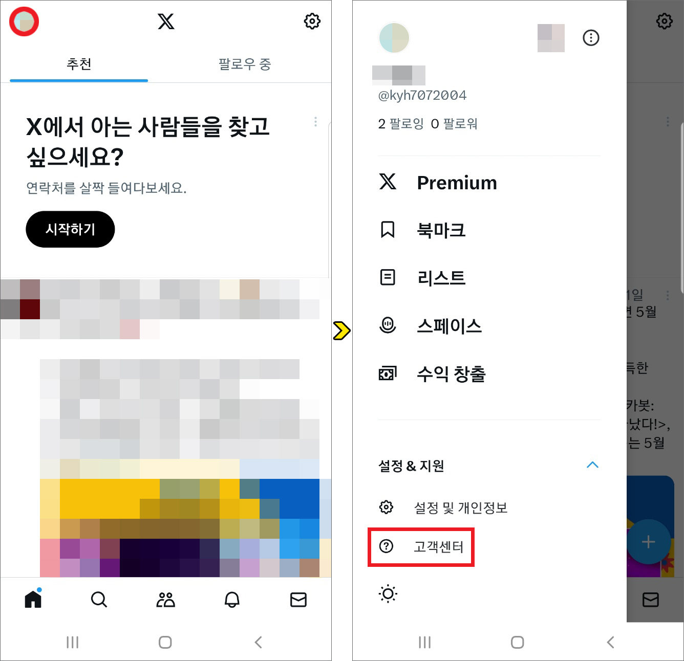 X 앱을 실행한 다음 좌측 상단에 있는 프로필을 탭하고 설정 & 지원 옆에 Ⅴ 표시를 눌러보시면 [고객센터]를 찾을 수 있으니 터치해 줍니다.
