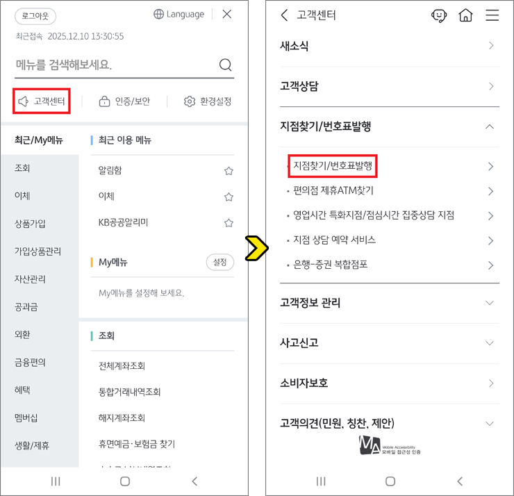 지점찾기/번호표발행 항목을 선택하고 하위 메뉴에서 [지점찾기/번호표발행]을 누릅니다.
