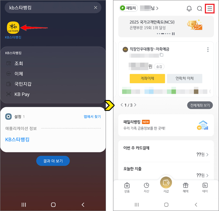 일단은 KB스타뱅킹 앱을 실행하셔야 되는데 모바일 앱이 깔려있지 않은 상태라면 스토어 앱(갤럭시> Play 스토어, 아이폰> 앱 스토어)에 들어가서 'KB스타뱅킹'을 검색 후 설치부터 해줍니다.