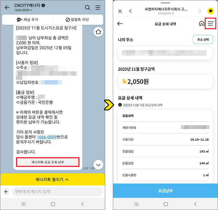 카톡에서 도시가스 스마트 서비스인 '에너지톡'을 이용하면 대전 도시가스 요금조회뿐만 아니라 요금납부 메뉴에서 요금 상세 내역, 납부 내역, 최근 사용량 분석, 실시간 요금계산기를 이용할 수 있으니 추천드립니다.