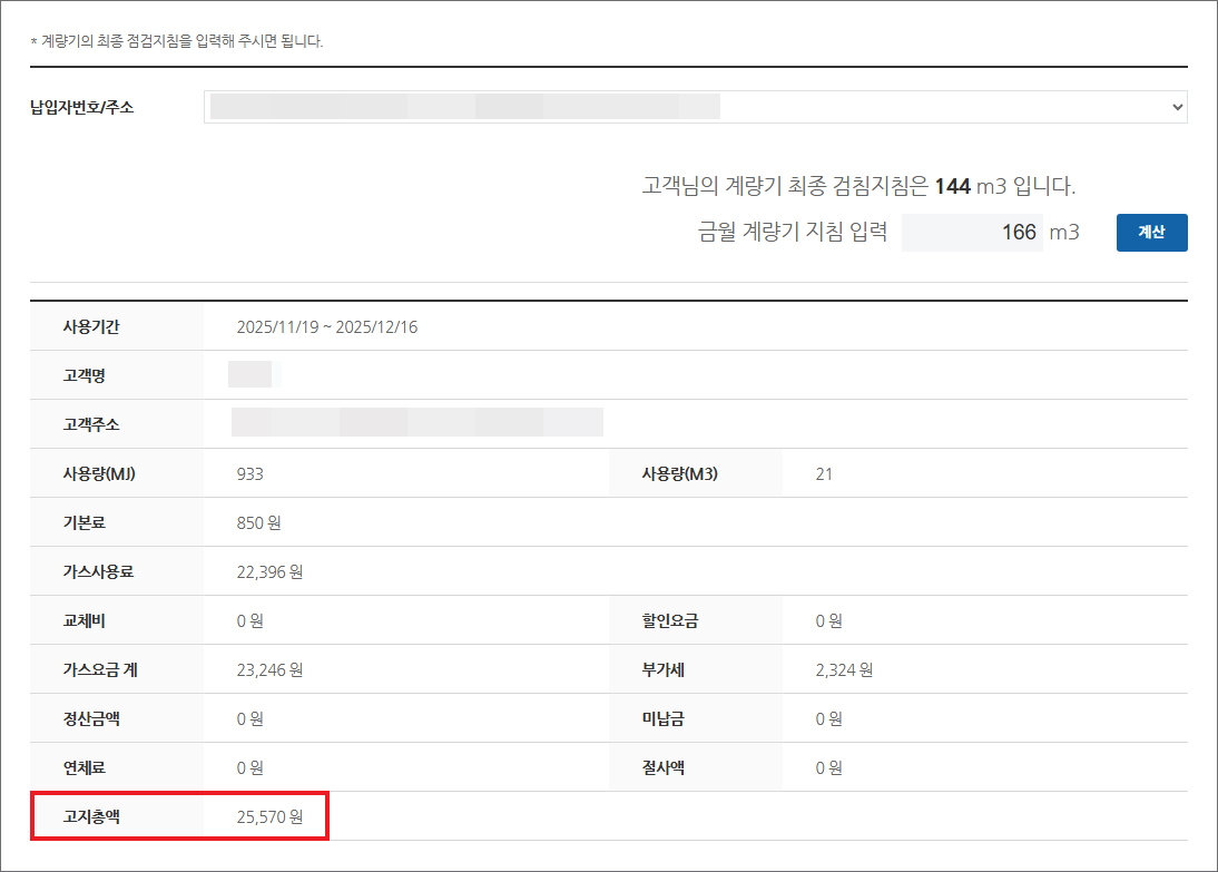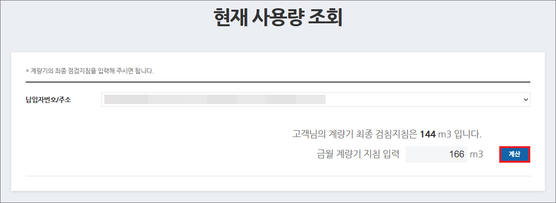 예를 들어서 맨 앞에 숫자 5자리가 00166이면 맨 앞에 있는 00은 실제 요금 부과에 사용되는 검침값에 포함되지 않으니 생략하고 '166'만 입력하면 될 것이며 정확히 입력한 상태에서 [계산] 버튼을 누릅니다.